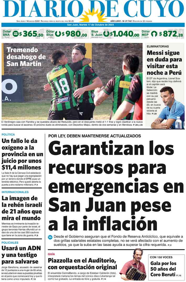Diario de Cuyo | HOME | Noticias Tapa Edición 17 de Octubre del 2023 Por Redacción Diario de Cuyo 16/10/2023 · 0:00 Escuchar la noticia Escuchar la noticia Your browser doesn’t support HTML5 audio Ver los comentarios ›