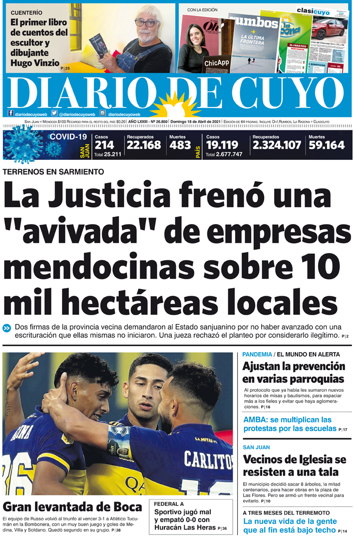 Diario de Cuyo | HOME | Noticias Tapa Edición 18 de Abril del 2021 Por Redacción Diario de Cuyo 17/04/2021 · 0:00 Escuchar la noticia Escuchar la noticia Your browser doesn’t support HTML5 audio Ver los comentarios ›