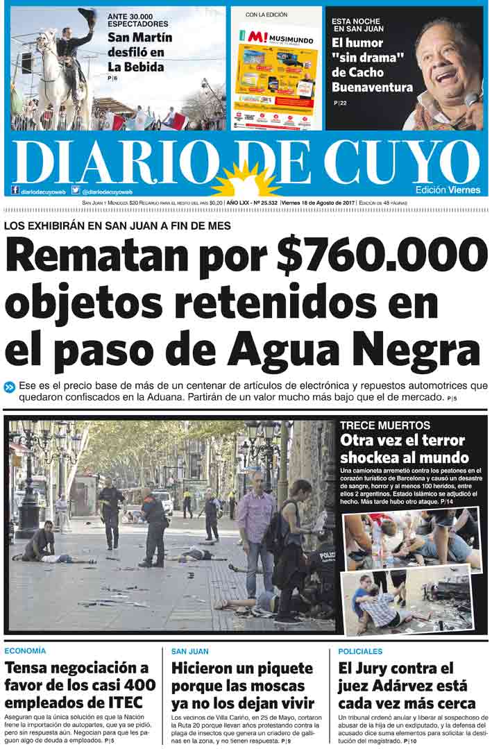 Diario de Cuyo | HOME | Noticias Tapa Edición 18 de Agosto de 2017 Por Redacción Diario de Cuyo 17/08/2017 · 0:00 Escuchar la noticia Escuchar la noticia Your browser doesn’t support HTML5 audio Ver los comentarios ›