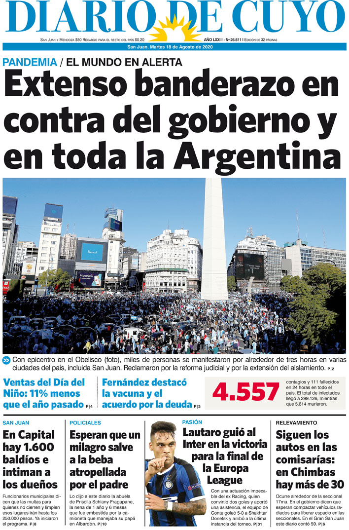 Diario de Cuyo | HOME | Noticias Tapa Edición 18 de Agosto del 2020 Por Redacción Diario de Cuyo 17/08/2020 · 0:00 Escuchar la noticia Escuchar la noticia Your browser doesn’t support HTML5 audio Ver los comentarios ›