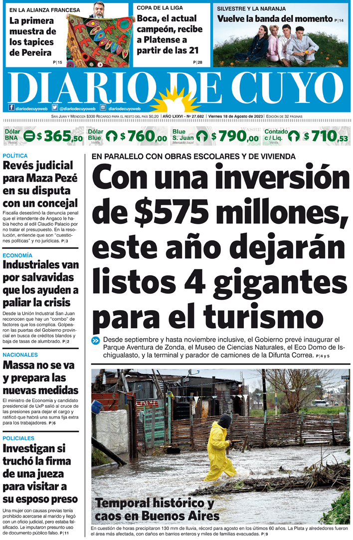 Diario de Cuyo | HOME | Noticias Tapa Edición 18 de Agosto del 2023 Por Redacción Diario de Cuyo 17/08/2023 · 0:00 Escuchar la noticia Escuchar la noticia Your browser doesn’t support HTML5 audio Ver los comentarios ›