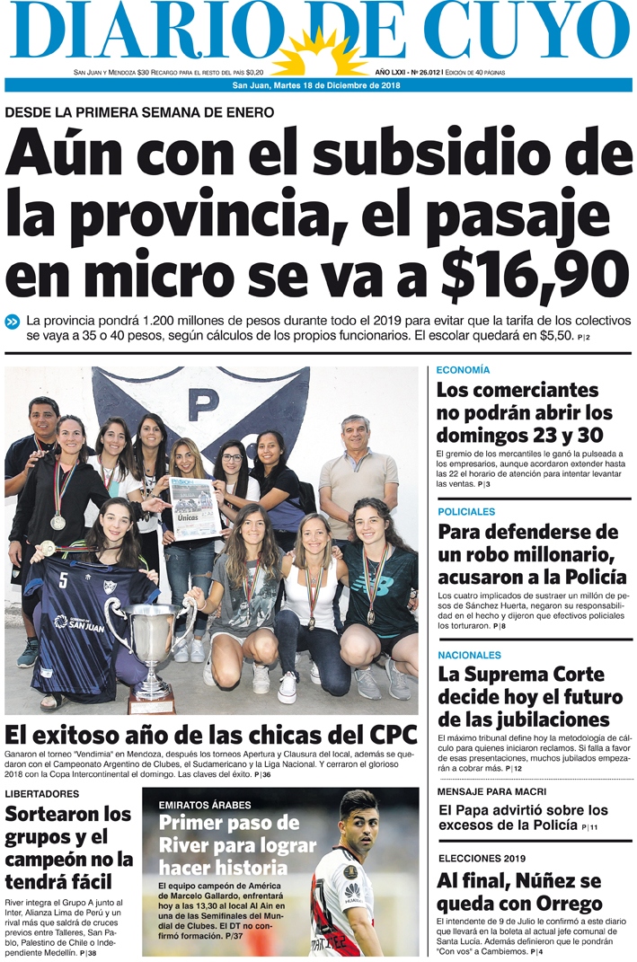 Diario de Cuyo | HOME | Noticias | Tapa Edición Tapa Edición 18 de Diciembre 2018 Por Redacción Diario de Cuyo 17/12/2018 · 0:00 Escuchar la noticia Escuchar la noticia Your browser doesn’t support HTML5 audio Tapa Edición Ver los comentarios ›
