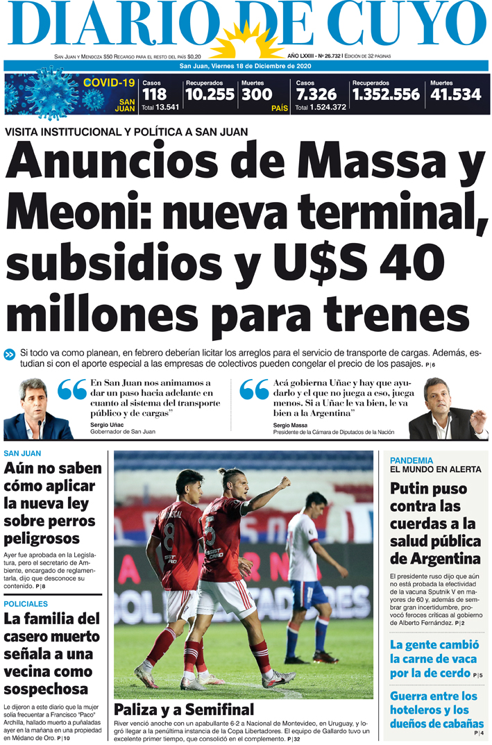 Diario de Cuyo | HOME | Noticias Tapa Edición 18 de Diciembre del 2020 Por Redacción Diario de Cuyo 17/12/2020 · 0:00 Escuchar la noticia Escuchar la noticia Your browser doesn’t support HTML5 audio Ver los comentarios ›