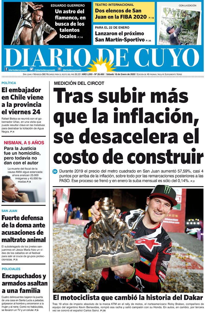Diario de Cuyo | HOME | Noticias Tapa Edición 18 de Enero de 2020 Por Redacción Diario de Cuyo 17/01/2020 · 0:00 Escuchar la noticia Escuchar la noticia Your browser doesn’t support HTML5 audio Ver los comentarios ›