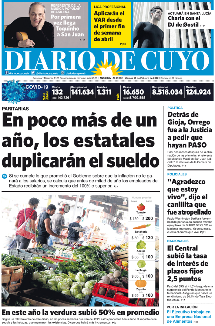 Diario de Cuyo | HOME | Noticias Tapa Edición 18 de Febrero del 2022 Por Redacción Diario de Cuyo 17/02/2022 · 0:00 Escuchar la noticia Escuchar la noticia Your browser doesn’t support HTML5 audio Ver los comentarios ›