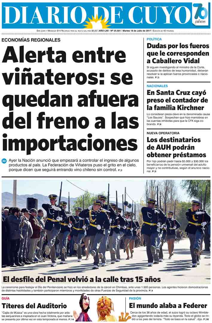 Diario de Cuyo | HOME | Noticias Tapa Edición 18 de Julio de 2017 Por Redacción Diario de Cuyo 17/07/2017 · 0:00 Escuchar la noticia Escuchar la noticia Your browser doesn’t support HTML5 audio Ver los comentarios ›