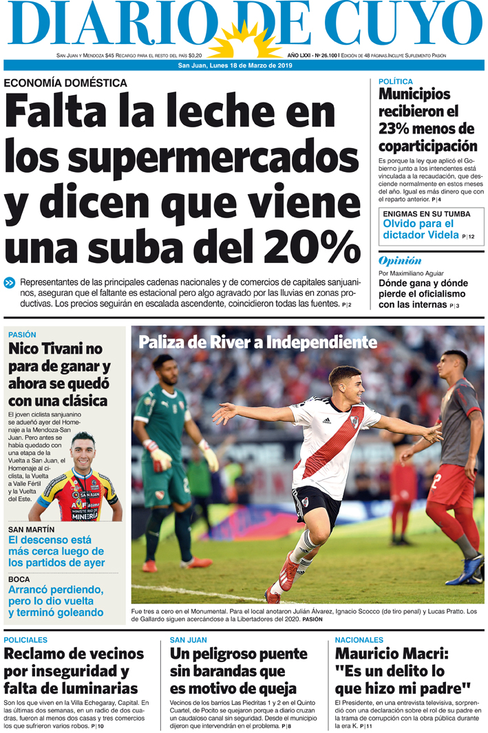 Diario de Cuyo | HOME | Noticias | Tapa Edición Tapa Edición 18 de Marzo 2019 Por Redacción Diario de Cuyo 17/03/2019 · 0:00 Escuchar la noticia Escuchar la noticia Your browser doesn’t support HTML5 audio Tapa Edición Ver los comentarios ›