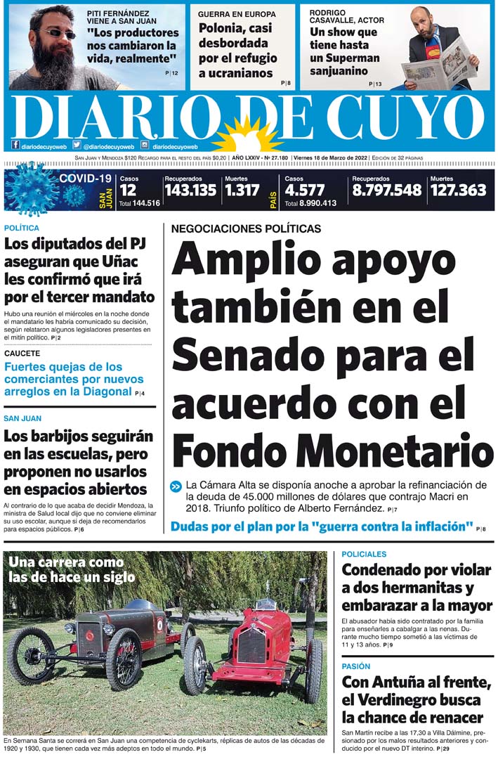 Diario de Cuyo | HOME | Noticias Tapa Edición 18 de Marzo de 2022 Por Redacción Diario de Cuyo 17/03/2022 · 0:00 Escuchar la noticia Escuchar la noticia Your browser doesn’t support HTML5 audio Ver los comentarios ›