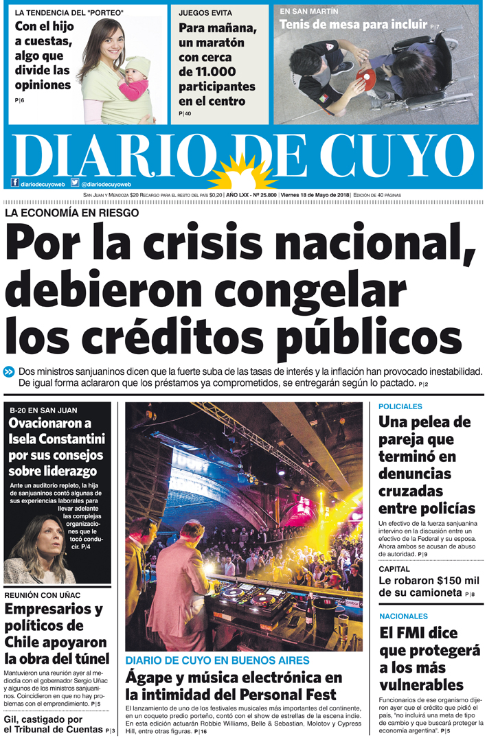 Diario de Cuyo | HOME | Noticias | Tapa Edición Tapa Edición 18 de Mayo de 2018 Por Redacción Diario de Cuyo 18/05/2018 · 0:00 Escuchar la noticia Escuchar la noticia Your browser doesn’t support HTML5 audio Tapa Edición Ver los comentarios ›