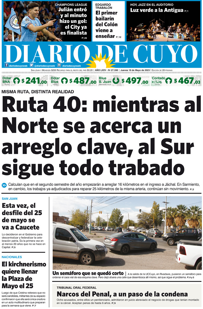 Diario de Cuyo | HOME | Noticias Tapa Edición 18 de Mayo de 2023 Por Redacción Diario de Cuyo 17/05/2023 · 0:00 Escuchar la noticia Escuchar la noticia Your browser doesn’t support HTML5 audio Ver los comentarios ›