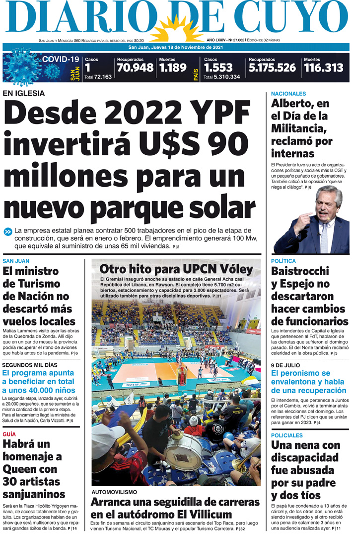 Diario de Cuyo | HOME | Noticias Tapa Edición 18 de Noviembre del 2021 Por Redacción Diario de Cuyo 18/11/2021 · 0:00 Escuchar la noticia Escuchar la noticia Your browser doesn’t support HTML5 audio Ver los comentarios ›