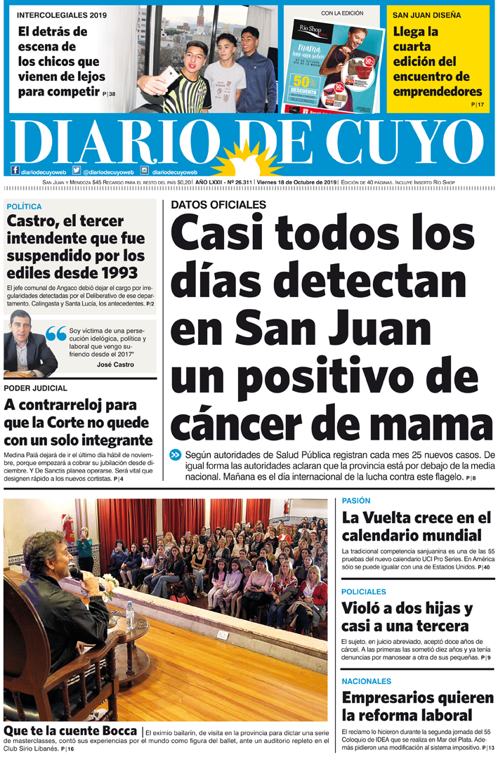 Diario de Cuyo | HOME | Noticias | Tapa Edición Tapa Edición 18 de Octubre 2019 Por Redacción Diario de Cuyo 17/10/2019 · 0:00 Escuchar la noticia Escuchar la noticia Your browser doesn’t support HTML5 audio Tapa Edición Ver los comentarios ›