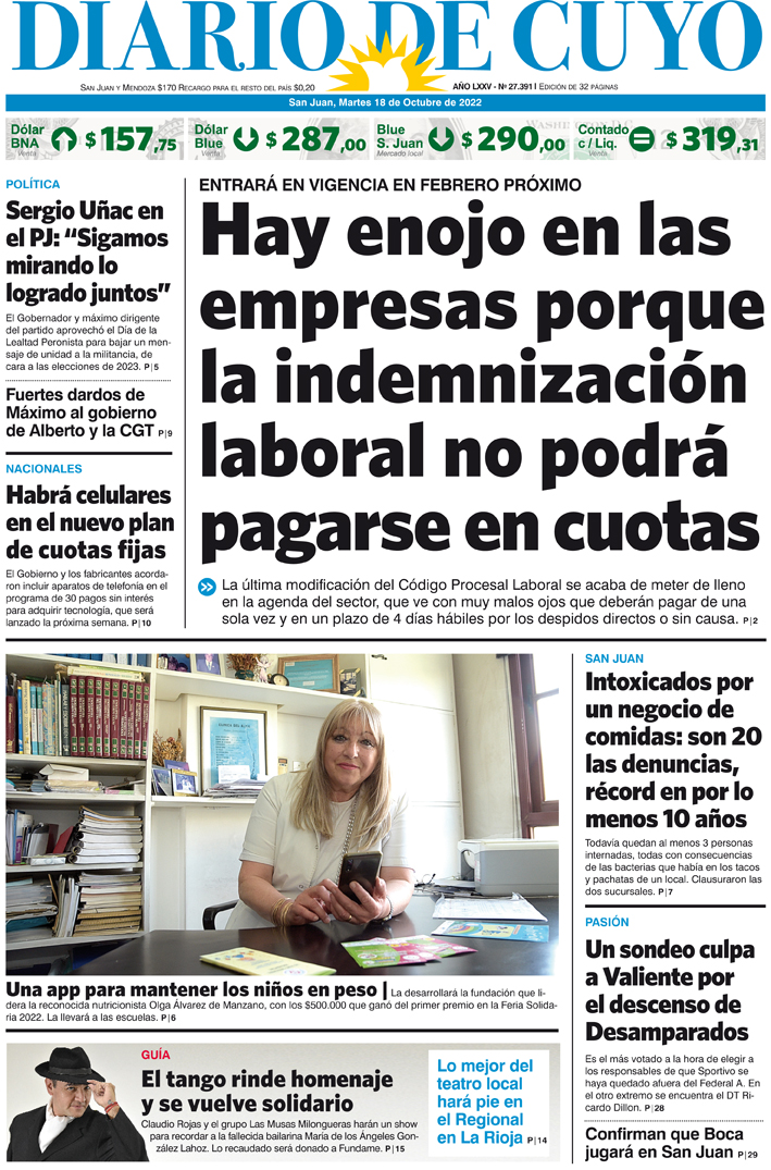 Diario de Cuyo | HOME | Noticias Tapa Edición 18 de Octubre del 2022 Por Redacción Diario de Cuyo 17/10/2022 · 0:00 Escuchar la noticia Escuchar la noticia Your browser doesn’t support HTML5 audio Ver los comentarios ›
