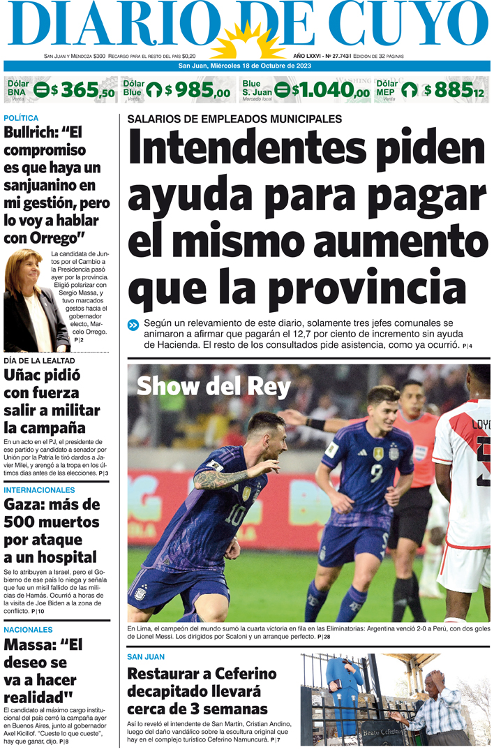 Diario de Cuyo | HOME | Noticias Tapa Edición 18 de Octubre del 2023 Por Redacción Diario de Cuyo 18/10/2023 · 0:00 Escuchar la noticia Escuchar la noticia Your browser doesn’t support HTML5 audio Ver los comentarios ›