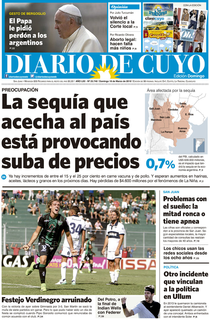 Diario de Cuyo | HOME | Noticias | Tapa Edición Tapa Edición 18 Marzo del 2018 Por Redacción Diario de Cuyo 17/03/2018 · 0:00 Escuchar la noticia Escuchar la noticia Your browser doesn’t support HTML5 audio Tapa Edición Ver los comentarios ›
