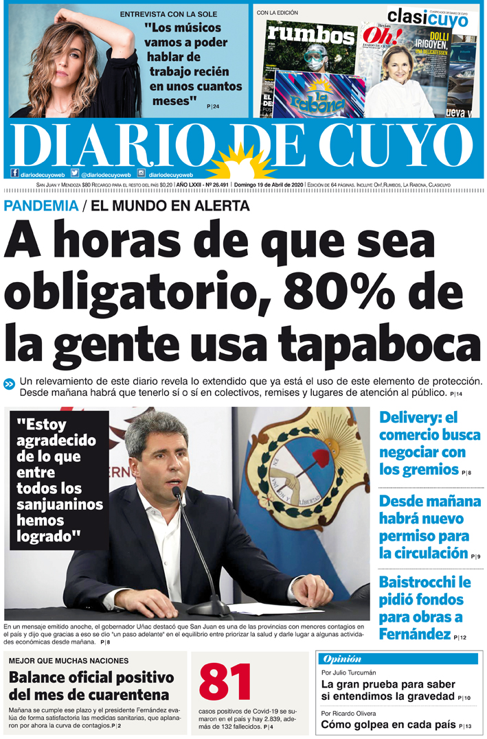 Diario de Cuyo | HOME | Noticias | Tapa Edición Tapa Edición 19 de Abril de 2020 Por Redacción Diario de Cuyo 18/04/2020 · 0:00 Escuchar la noticia Escuchar la noticia Your browser doesn’t support HTML5 audio Tapa Edición Ver los comentarios ›