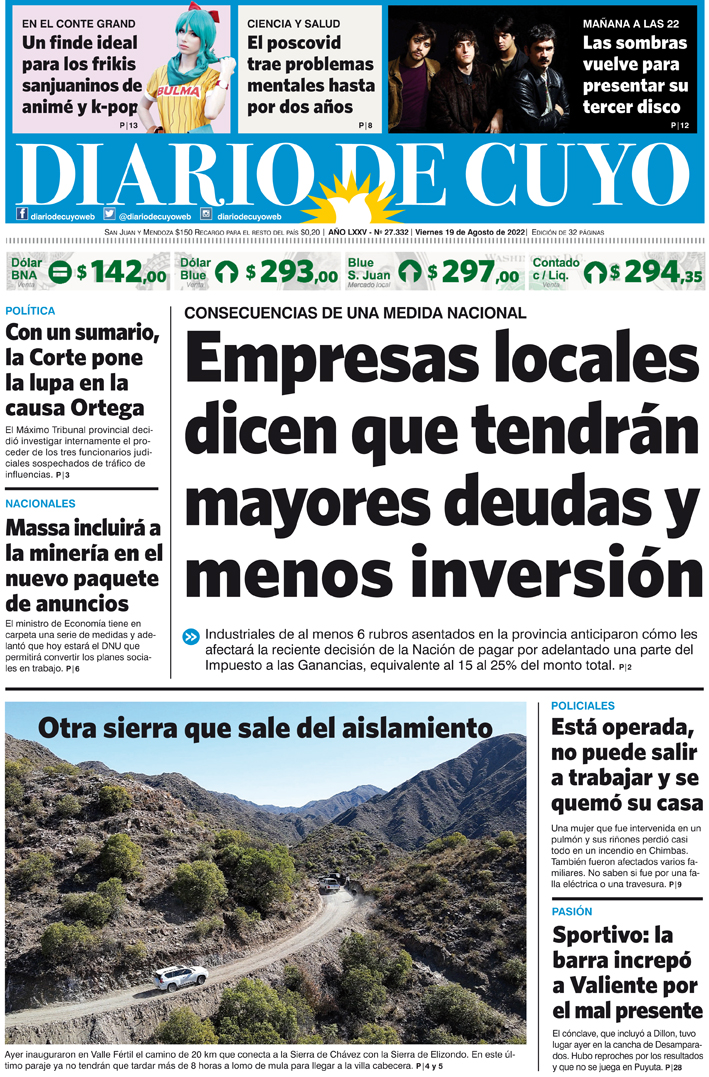 Diario de Cuyo | HOME | Noticias Tapa Edición 19 de Agosto del 2022 Por Redacción Diario de Cuyo 18/08/2022 · 0:00 Escuchar la noticia Escuchar la noticia Your browser doesn’t support HTML5 audio Ver los comentarios ›