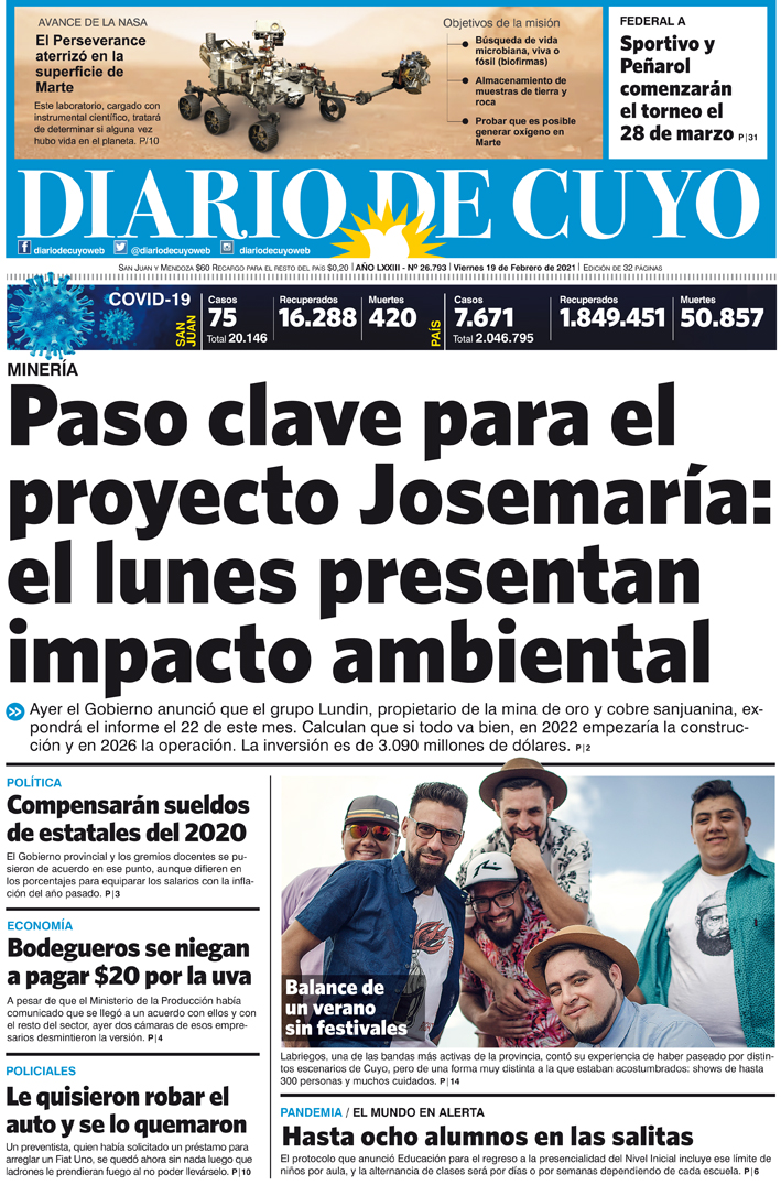 Diario de Cuyo | HOME | Noticias Tapa Edición 19 de Febrero del 2021 Por Redacción Diario de Cuyo 18/02/2021 · 0:00 Escuchar la noticia Escuchar la noticia Your browser doesn’t support HTML5 audio Ver los comentarios ›