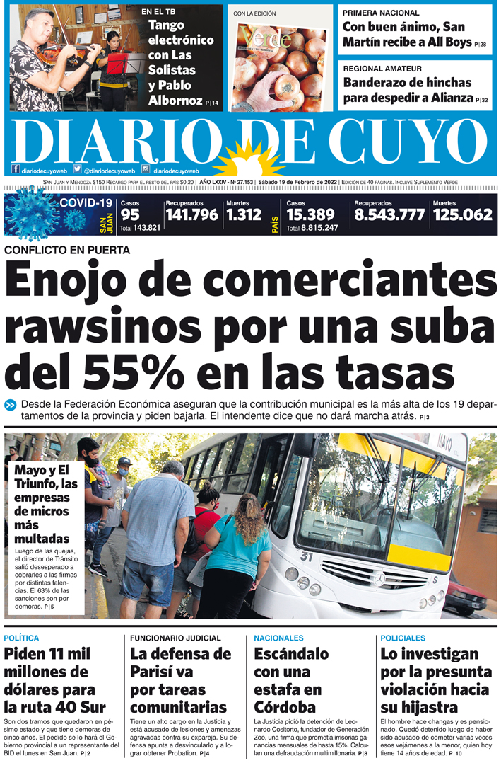 Diario de Cuyo | HOME | Noticias Tapa Edición 19 de Febrero del 2022 Por Redacción Diario de Cuyo 18/02/2022 · 0:00 Escuchar la noticia Escuchar la noticia Your browser doesn’t support HTML5 audio Ver los comentarios ›