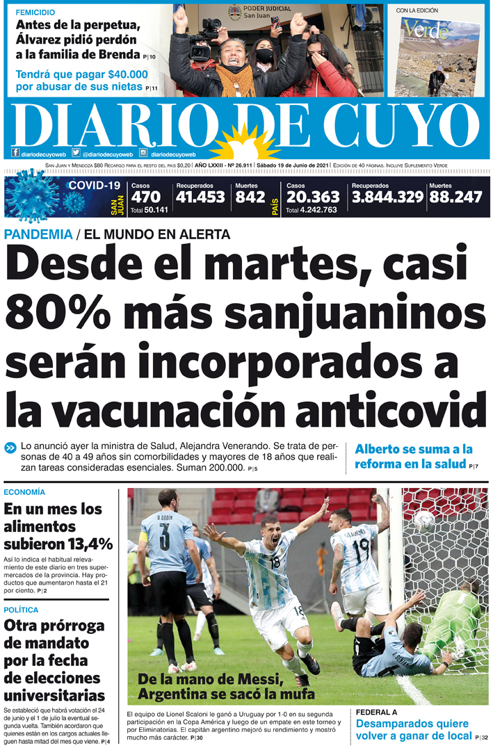 Diario de Cuyo | HOME | Noticias Tapa Edición 19 de Junio del 2021 Por Redacción Diario de Cuyo 18/06/2021 · 0:00 Escuchar la noticia Escuchar la noticia Your browser doesn’t support HTML5 audio Ver los comentarios ›
