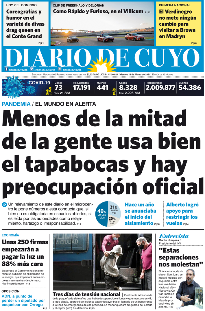 Diario de Cuyo | HOME | Noticias | Tapa Edición Tapa Edición 19 de Marzo de 2021 Por Redacción Diario de Cuyo 18/03/2021 · 0:00 Escuchar la noticia Escuchar la noticia Your browser doesn’t support HTML5 audio Tapa Edición Ver los comentarios ›