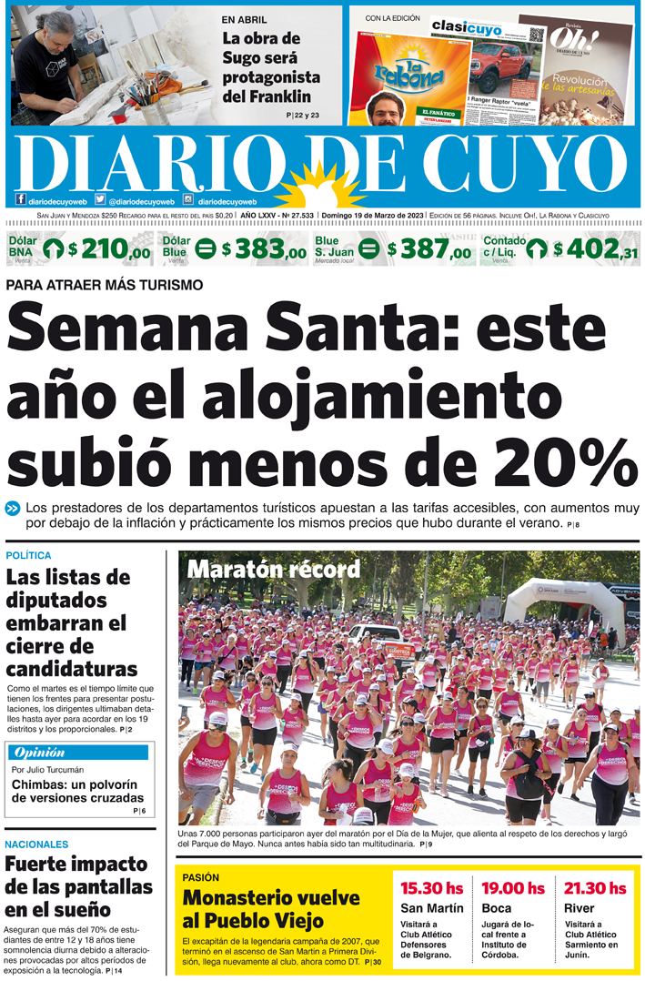 Diario de Cuyo | HOME | Noticias Tapa Edición 19 de Marzo del 2023 Por Redacción Diario de Cuyo 18/03/2023 · 0:00 Escuchar la noticia Escuchar la noticia Your browser doesn’t support HTML5 audio Ver los comentarios ›