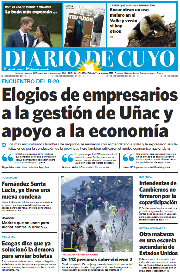 Diario de Cuyo | HOME | Noticias Tapa Edición 19 de Mayo de 2018 Por Redacción Diario de Cuyo 19/05/2018 · 0:00 Escuchar la noticia Escuchar la noticia Your browser doesn’t support HTML5 audio Ver los comentarios ›
