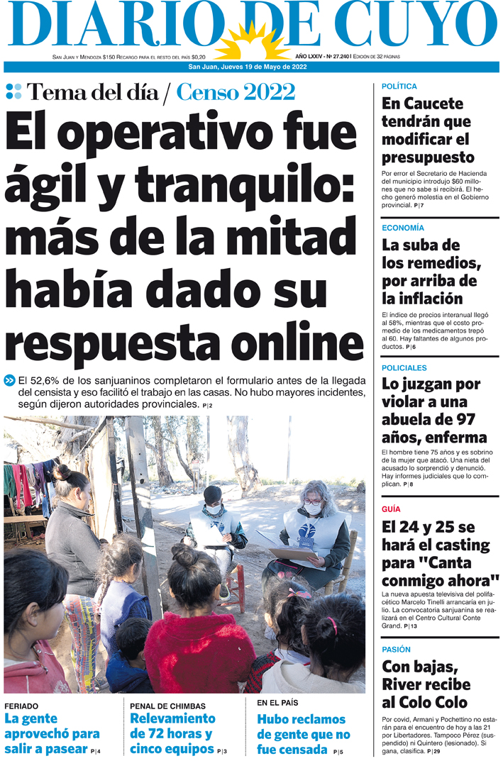 Diario de Cuyo | HOME | Noticias Tapa Edición 19 de Mayo del 2022 Por Redacción Diario de Cuyo 18/05/2022 · 0:00 Escuchar la noticia Escuchar la noticia Your browser doesn’t support HTML5 audio Ver los comentarios ›