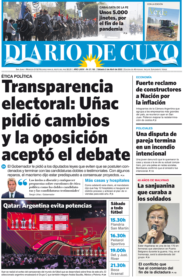 Diario de Cuyo | HOME | Noticias Tapa Edición 2 de Abril de 2022 Por Redacción Diario de Cuyo 01/04/2022 · 0:00 Escuchar la noticia Escuchar la noticia Your browser doesn’t support HTML5 audio Ver los comentarios ›