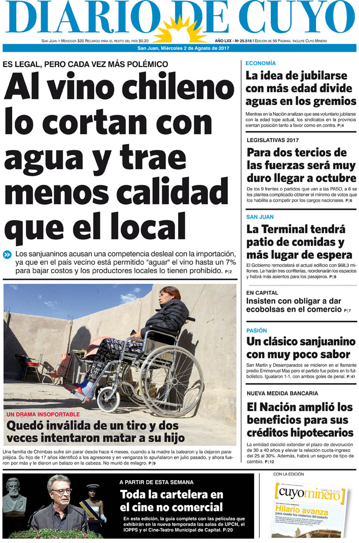 Diario de Cuyo | HOME | Noticias Tapa Edición 2 de Agosto del 2017 Por Redacción Diario de Cuyo 02/08/2017 · 0:00 Escuchar la noticia Escuchar la noticia Your browser doesn’t support HTML5 audio Ver los comentarios ›