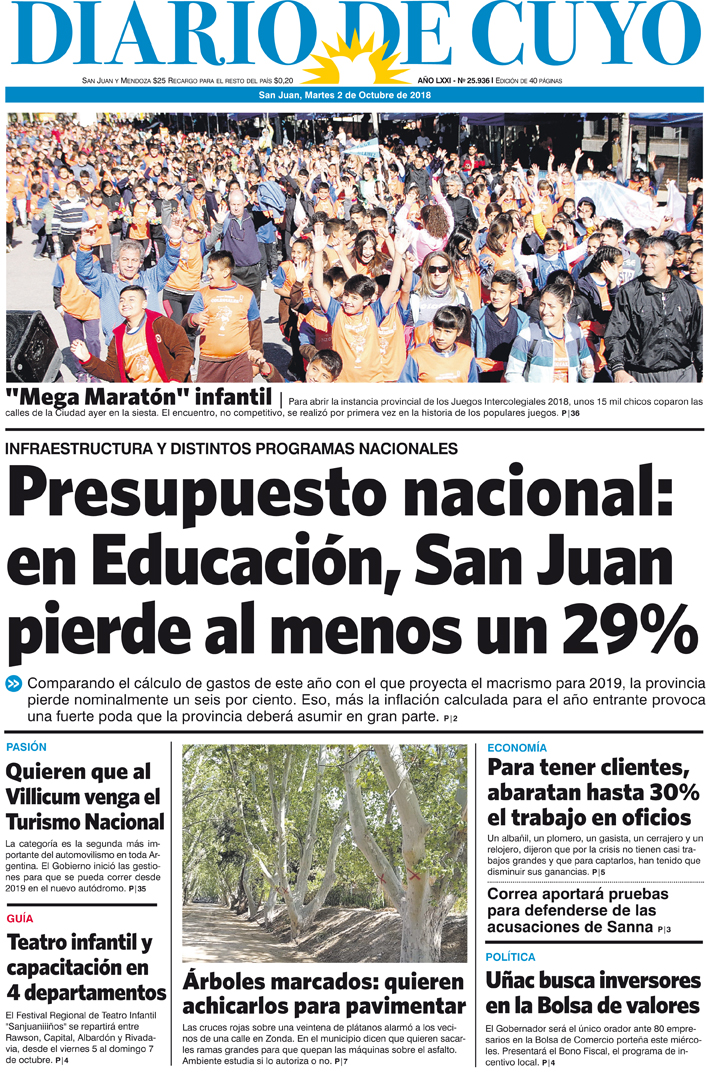 Diario de Cuyo | HOME | Noticias | Tapa Edición Tapa Edición 2 de Octubre 2018 Por Redacción Diario de Cuyo 01/10/2018 · 0:00 Escuchar la noticia Escuchar la noticia Your browser doesn’t support HTML5 audio Tapa Edición Ver los comentarios ›