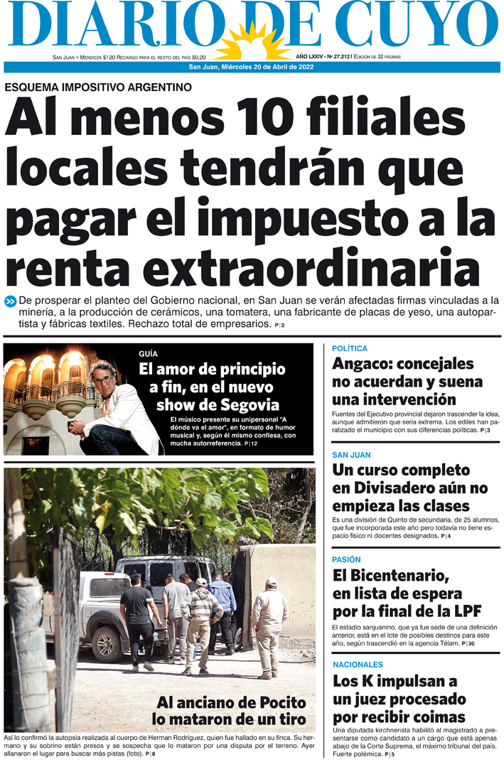 Diario de Cuyo | HOME | Noticias Tapa Edición 20 de Abril del 2022 Por Redacción Diario de Cuyo 19/04/2022 · 0:00 Escuchar la noticia Escuchar la noticia Your browser doesn’t support HTML5 audio Ver los comentarios ›