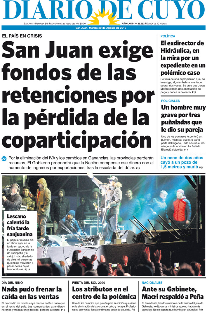 Diario de Cuyo | HOME | Noticias | Tapa Edición Tapa Edición 20 de Agosto de 2019 Por Redacción Diario de Cuyo 19/08/2019 · 0:00 Escuchar la noticia Escuchar la noticia Your browser doesn’t support HTML5 audio Tapa Edición Ver los comentarios ›