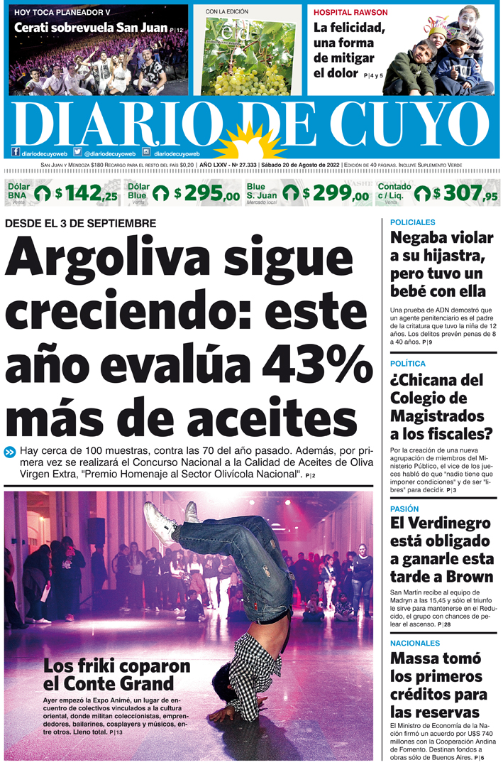 Diario de Cuyo | HOME | Noticias Tapa Edición 20 de Agosto del 2022 Por Redacción Diario de Cuyo 19/08/2022 · 0:00 Escuchar la noticia Escuchar la noticia Your browser doesn’t support HTML5 audio Ver los comentarios ›