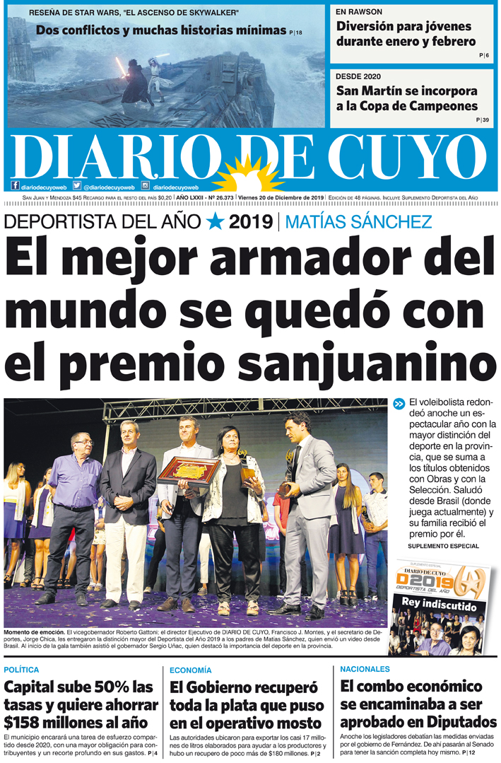 Diario de Cuyo | HOME | Noticias Tapa Edición 20 de Diciembre 2019 Por Redacción Diario de Cuyo 20/12/2019 · 0:00 Escuchar la noticia Escuchar la noticia Your browser doesn’t support HTML5 audio Ver los comentarios ›