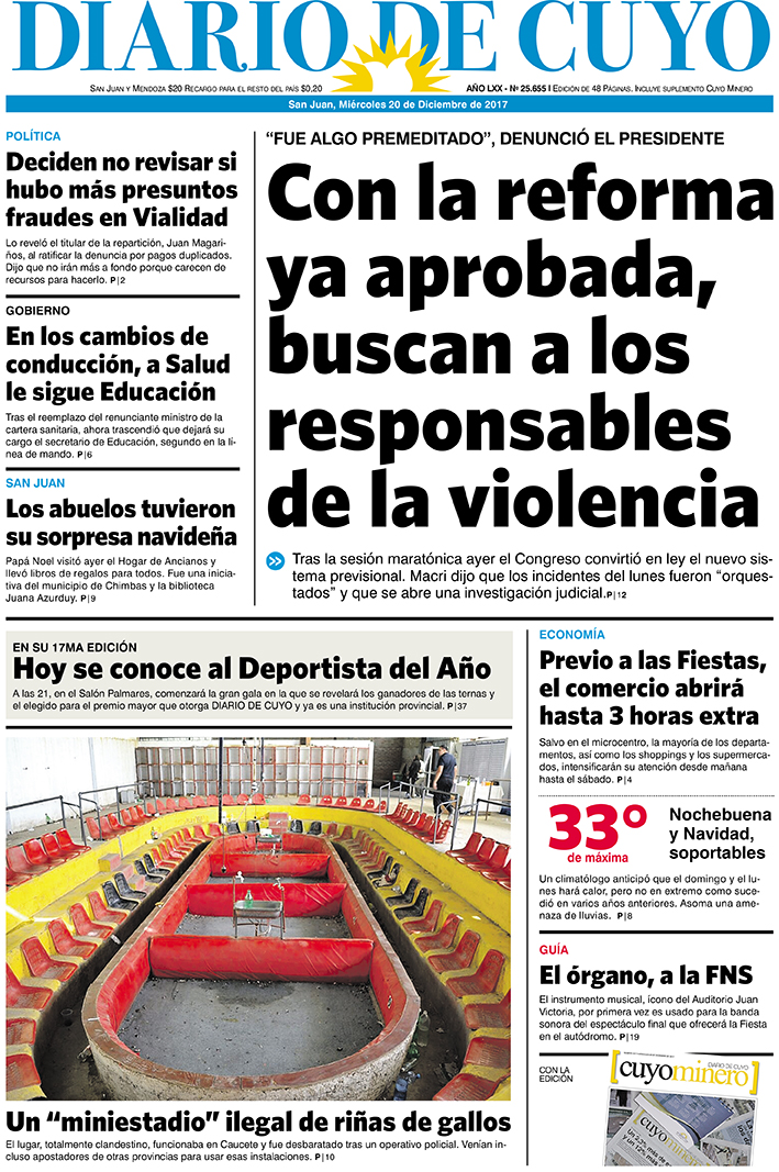 Diario de Cuyo | HOME | Noticias | Tapa Edición Tapa Edición 20 de Diciembre de 2017 Por Redacción Diario de Cuyo 19/12/2017 · 0:00 Escuchar la noticia Escuchar la noticia Your browser doesn’t support HTML5 audio Tapa Edición Ver los comentarios ›