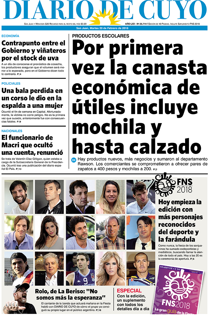 Diario de Cuyo | HOME | Noticias | Tapa Edición Tapa Edición 20 de Febrero del 2018 Por Redacción Diario de Cuyo 19/02/2018 · 0:00 Escuchar la noticia Escuchar la noticia Your browser doesn’t support HTML5 audio Tapa Edición Ver los comentarios ›