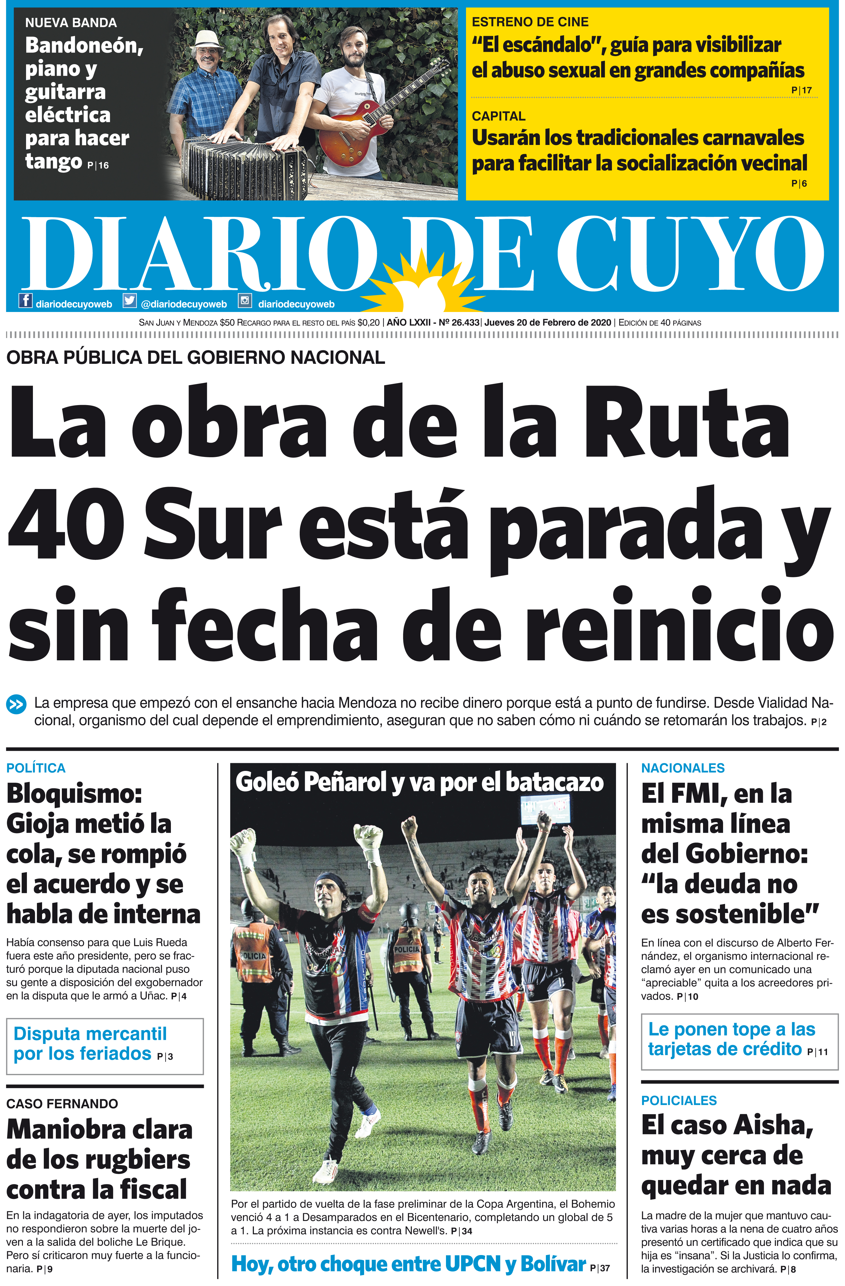 Diario de Cuyo | HOME | Noticias Tapa Edición 20 de Febrero del 2020 Por Redacción Diario de Cuyo 20/02/2020 · 0:00 Escuchar la noticia Escuchar la noticia Your browser doesn’t support HTML5 audio Ver los comentarios ›