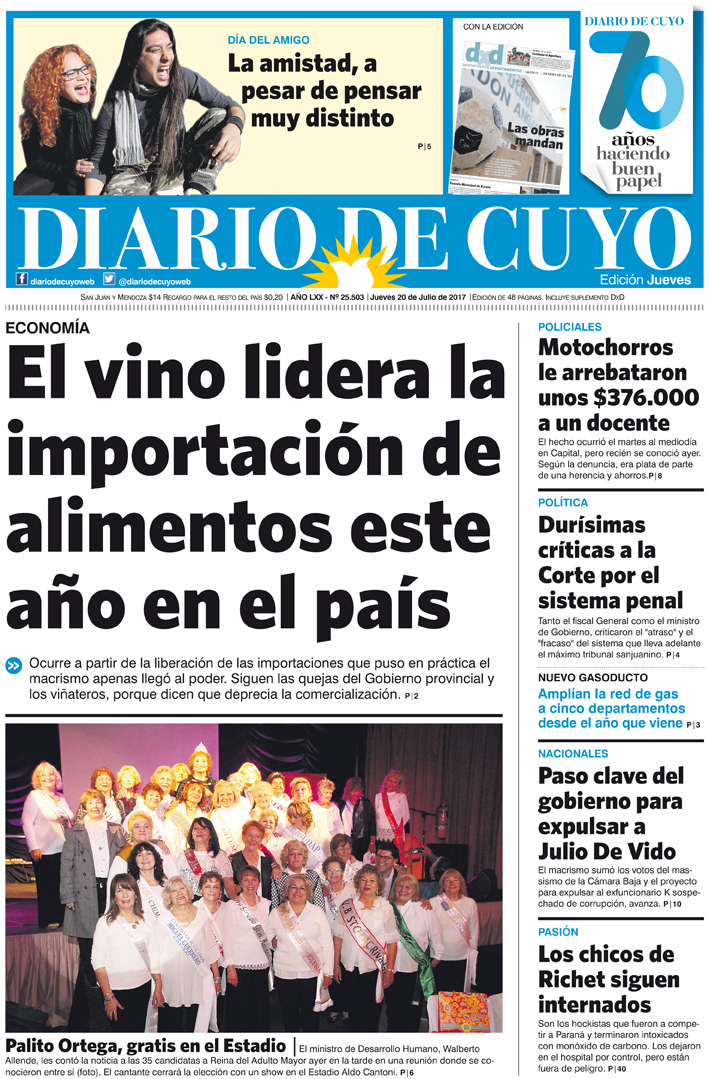 Diario de Cuyo | HOME | Noticias Tapa Edición 20 de Julio del 2017 Por Redacción Diario de Cuyo 19/07/2017 · 0:00 Escuchar la noticia Escuchar la noticia Your browser doesn’t support HTML5 audio Ver los comentarios ›