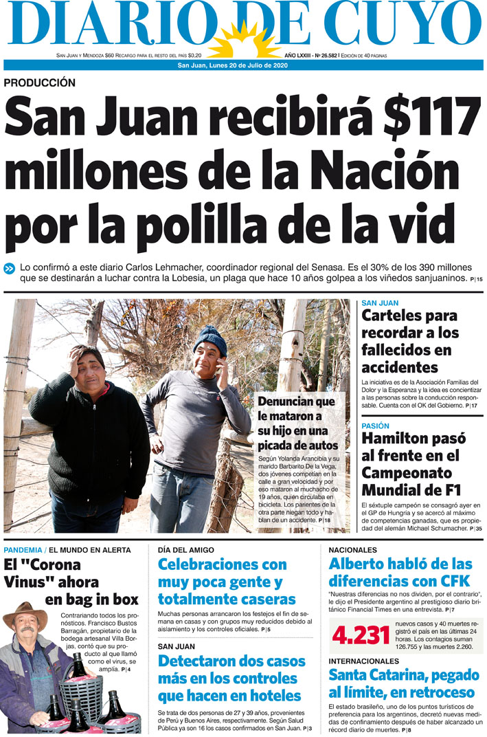 Diario de Cuyo | HOME | Noticias Tapa Edición 20 de Julio del 2020 Por Redacción Diario de Cuyo 19/07/2020 · 0:00 Escuchar la noticia Escuchar la noticia Your browser doesn’t support HTML5 audio Ver los comentarios ›