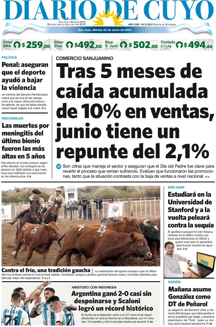 Diario de Cuyo | HOME | Noticias Tapa Edición 20 de Junio del 2023 Por Redacción Diario de Cuyo 19/06/2023 · 0:00 Escuchar la noticia Escuchar la noticia Your browser doesn’t support HTML5 audio Ver los comentarios ›
