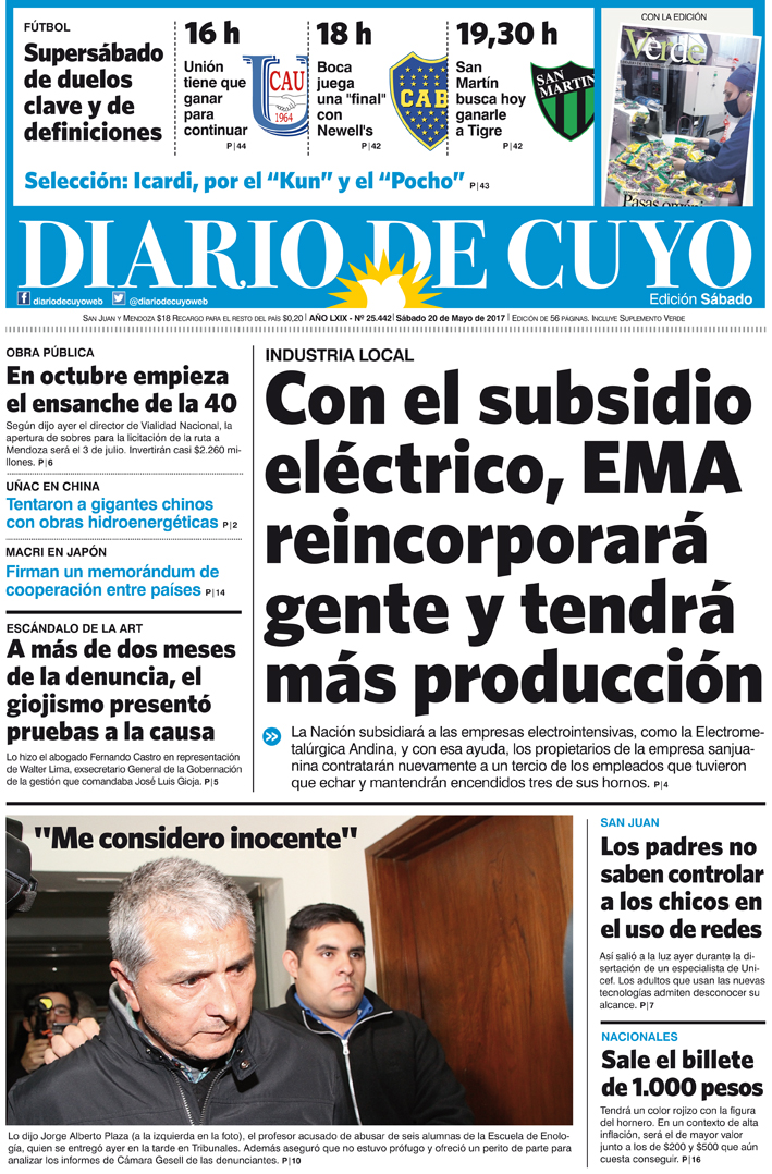 Diario de Cuyo | HOME | Noticias Tapa Edición 20 de Mayo del 2017 Por Redacción Diario de Cuyo 19/05/2017 · 0:00 Escuchar la noticia Escuchar la noticia Your browser doesn’t support HTML5 audio Ver los comentarios ›