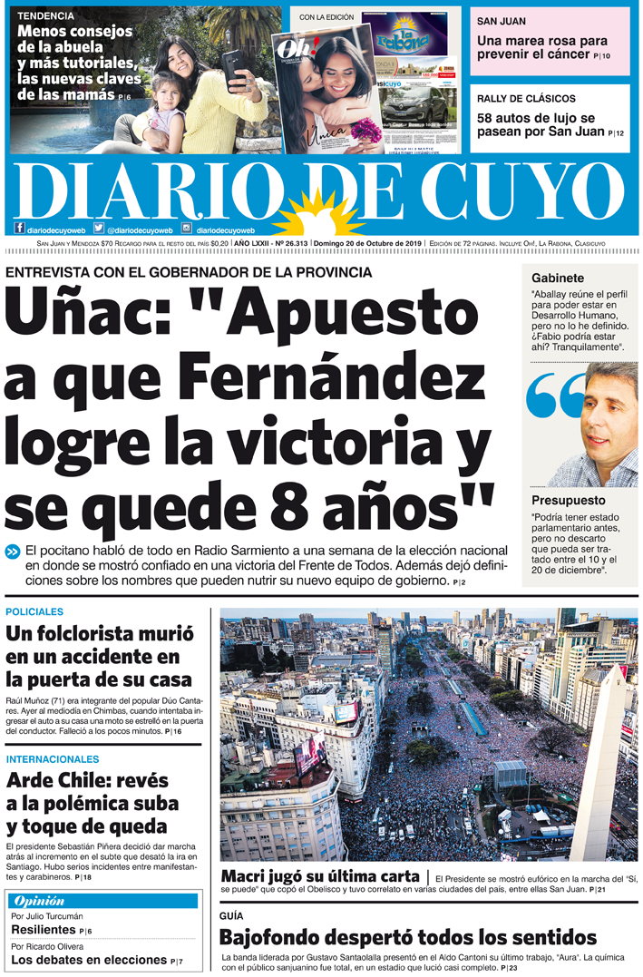 Diario de Cuyo | HOME | Noticias | Tapa Edición Tapa Edición 20 de Octubre 2019 Por Redacción Diario de Cuyo 20/10/2019 · 0:00 Escuchar la noticia Escuchar la noticia Your browser doesn’t support HTML5 audio Tapa Edición Ver los comentarios ›
