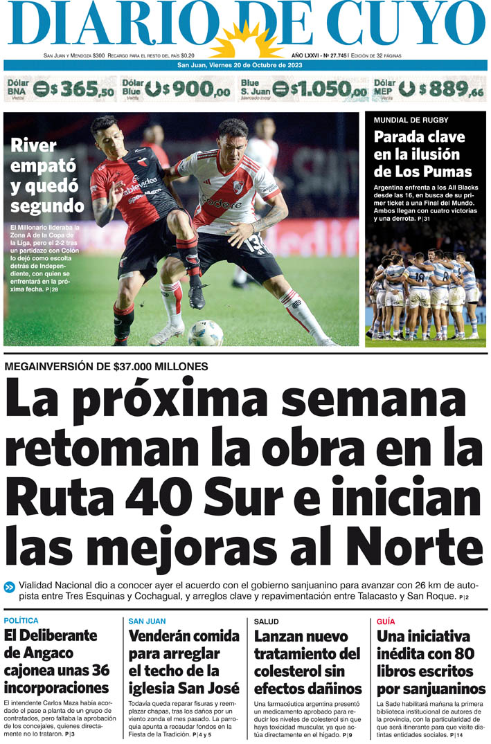 Diario de Cuyo | HOME | Noticias Tapa Edición 20 de Octubre de 2023 Por Redacción Diario de Cuyo 19/10/2023 · 0:00 Escuchar la noticia Escuchar la noticia Your browser doesn’t support HTML5 audio Ver los comentarios ›
