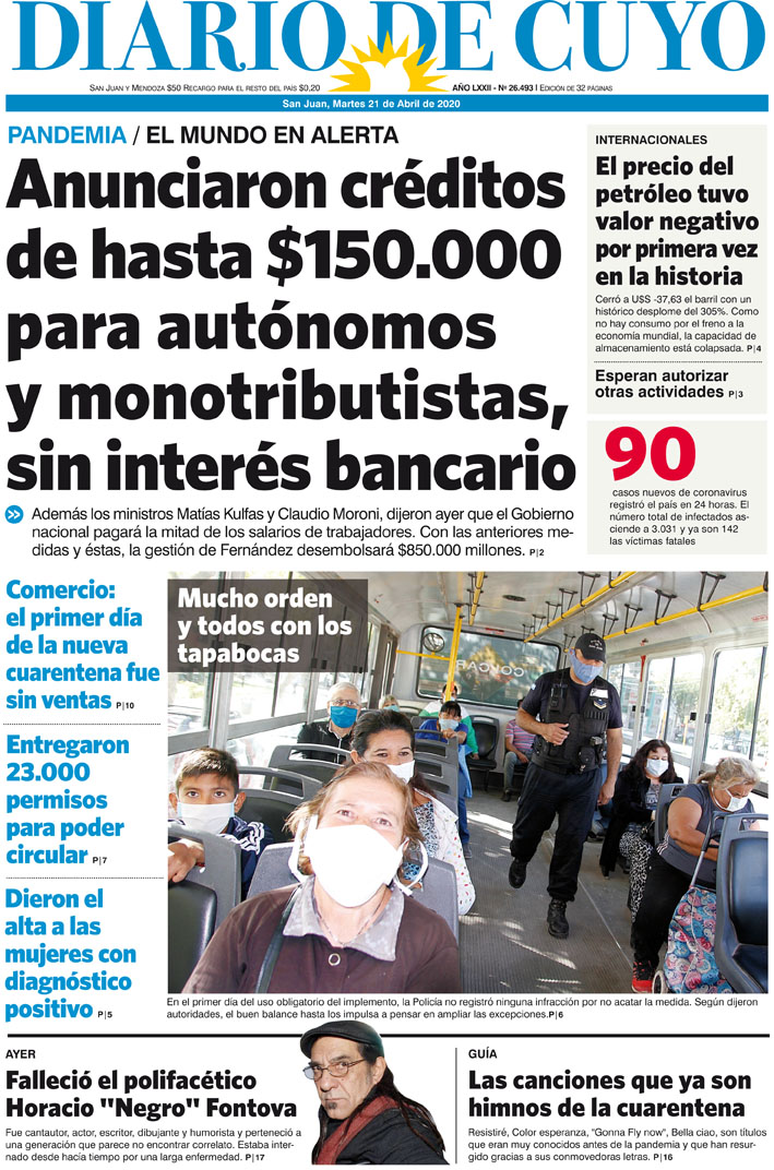 Diario de Cuyo | HOME | Noticias Tapa Edición 21 de Abril del 2020 Por Redacción Diario de Cuyo 20/04/2020 · 0:00 Escuchar la noticia Escuchar la noticia Your browser doesn’t support HTML5 audio Ver los comentarios ›