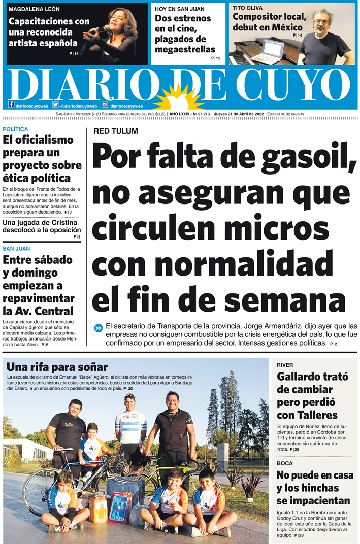 Diario de Cuyo | HOME | Noticias Tapa Edición 21 de Abril del 2022 Por Redacción Diario de Cuyo 21/04/2022 · 0:00 Escuchar la noticia Escuchar la noticia Your browser doesn’t support HTML5 audio Ver los comentarios ›