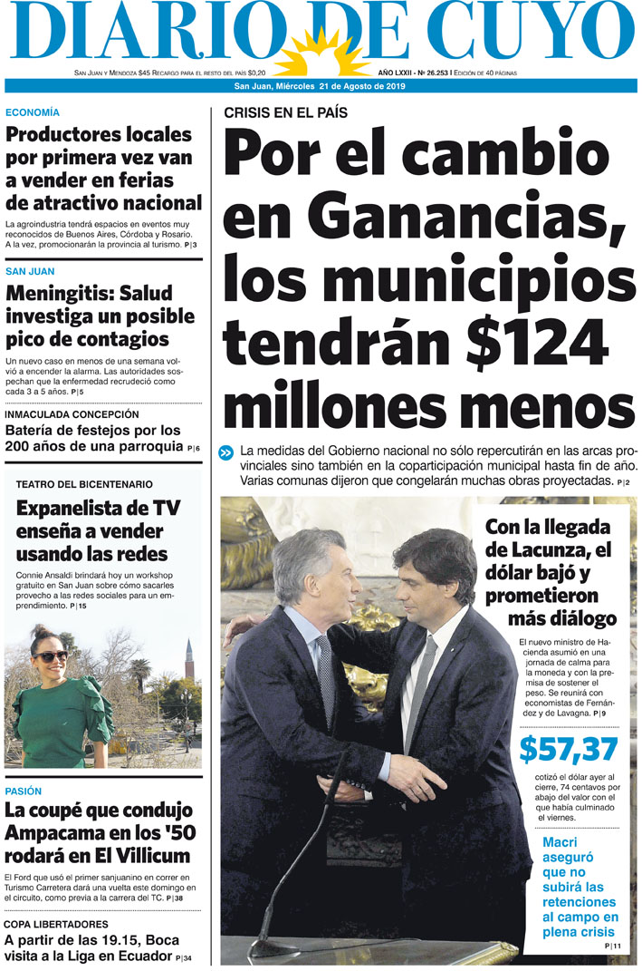 Diario de Cuyo | HOME | Noticias | Tapa Edición Tapa Edición 21 de Agosto 2019 Por Redacción Diario de Cuyo 20/08/2019 · 0:00 Escuchar la noticia Escuchar la noticia Your browser doesn’t support HTML5 audio Tapa Edición Ver los comentarios ›