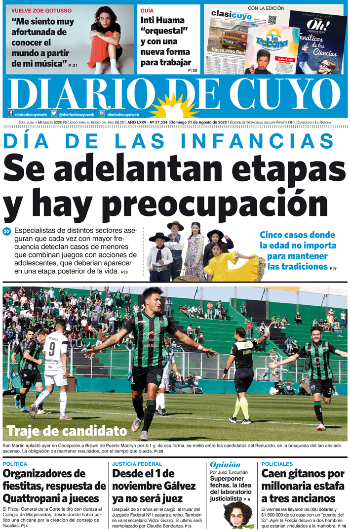 Diario de Cuyo | HOME | Noticias Tapa Edición 21 de Agosto de 2022 Por Redacción Diario de Cuyo 20/08/2022 · 0:00 Escuchar la noticia Escuchar la noticia Your browser doesn’t support HTML5 audio Ver los comentarios ›