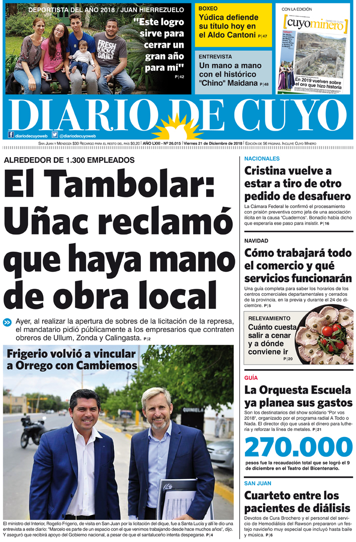 Diario de Cuyo | HOME | Noticias | Tapa Edición Tapa Edición 21 de Diciembre 2018 Por Redacción Diario de Cuyo 20/12/2018 · 0:00 Escuchar la noticia Escuchar la noticia Your browser doesn’t support HTML5 audio Tapa Edición Ver los comentarios ›