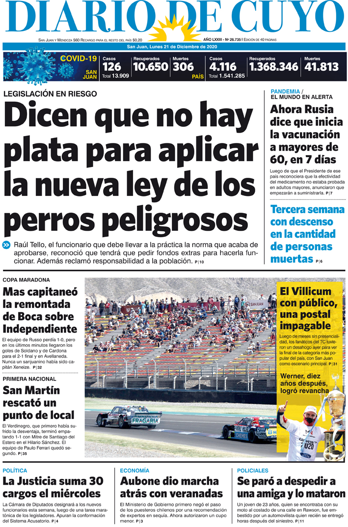 Diario de Cuyo | HOME | Noticias | Tapa Edición Tapa Edición 21 de Diciembre de 2020 Por Redacción Diario de Cuyo 20/12/2020 · 0:00 Escuchar la noticia Escuchar la noticia Your browser doesn’t support HTML5 audio Tapa Edición Ver los comentarios ›